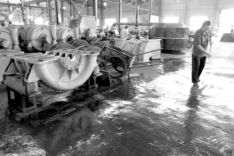 暴雨让湖北中意机电有限公司车间进水,连日来,工人们忙着擦洗设备、清扫泥浆、转运物品,尽快恢复生产。(本报记者 杨闻名 特约记者 李明清摄)
