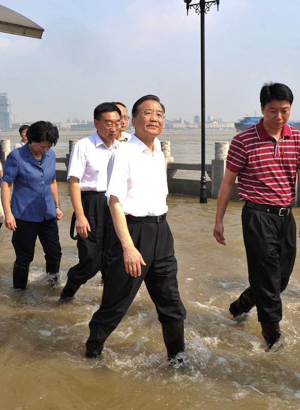 23日下午3时许,温家宝一下飞机就来到汉口龙王庙险段实地察看汛情。温家宝趟着一尺深的江水,考察了龙王庙综合整治区。从雨情到水情,从汛情到灾情,从防汛抗洪到群众生活安排,温家宝问得十分细致。当听到长江上游和汉江上游最近又降暴雨水势正在上涨时,温家宝叮嘱道,要再接再厉,充分准备,迎接新一轮洪水的考验。