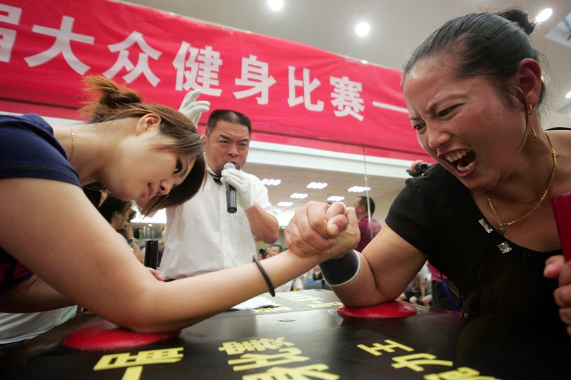 7月24日,参加杭州“腕力王”大赛的两名女选手在激烈角逐。当日,杭州市第一届大众健身比赛拉开帷幕,首场“腕力王”大赛吸引了数百名市民参与。此后杭州市还将在暑期的周末举行推举、引体向上、瑜伽等项目的比赛,鼓励市民积极参与体育健身活动。新华社发
