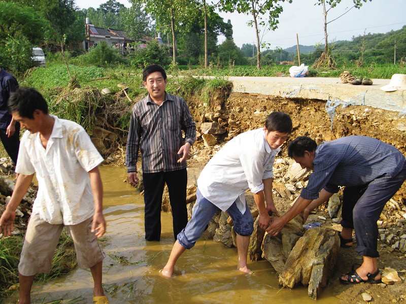 连日来,暴雨给随县厉山镇山区农民造成重大经济损失,海潮寺村“两委会”主动组织村民开展互助自救,抗灾促收,减轻灾害带来的损失。图为村干部带领村民们正在抢修被山洪冲垮的通村公路。 (龚承斌 摄)