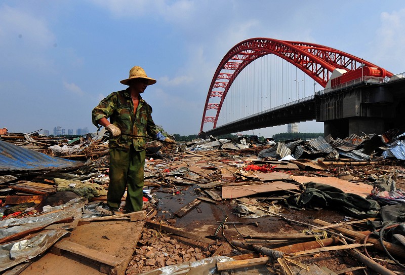 7月26日,工人正在汉江一桥下清理杂物。自从21日以来,长江武汉关水位一直在27米以上运行。与此同时,汉江水情更加严峻,水位已连续多日在警戒线以上运行,两江洪水在武汉汇集,给武汉防汛带来严峻考验。 (新华社发)