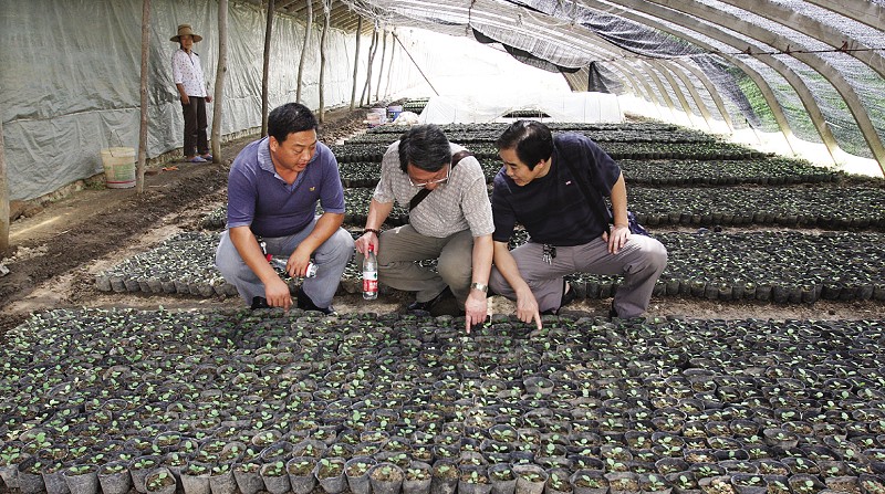 图⑤:农业技术人员在随县安居镇蔬菜基地指导菜农适时补苗,培育新品种。