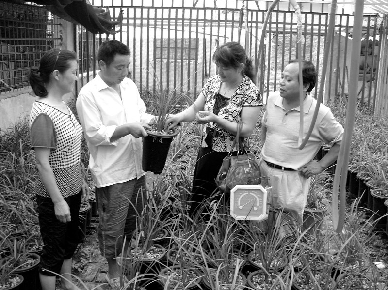 近日,随县万和镇兰花新区村以种植兰花致富的曹元和妻子正在向客人介绍兰花种植、管理经验。他家现种兰花一千多盆,二OO四年一株卖了十五万元。今年虽然行情走低,一株也能卖到二千元,收入仍十分可观。(石守京 温户 摄)
