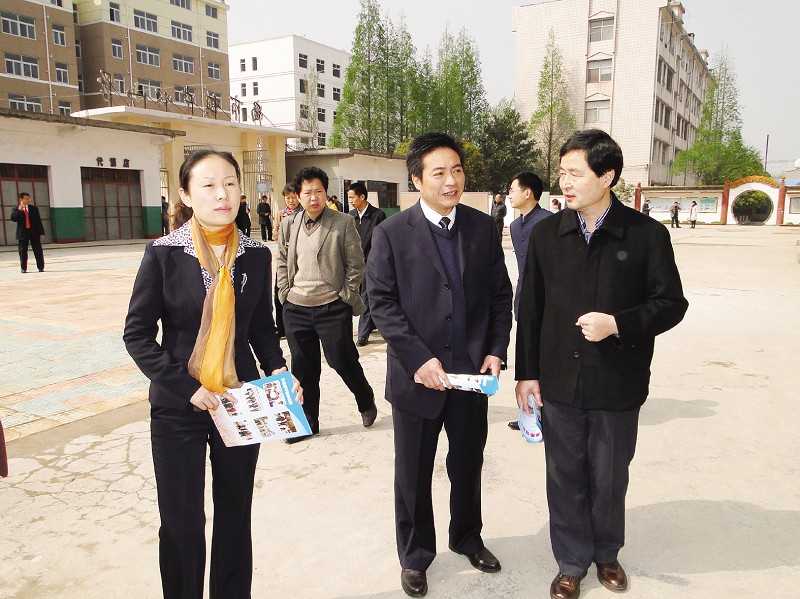 ▲省教育局副厅长欧阳建平(右一)在副县长刘玲(左一)和县教育局局长周煜(右二)的陪同下考察随县基础教育情况