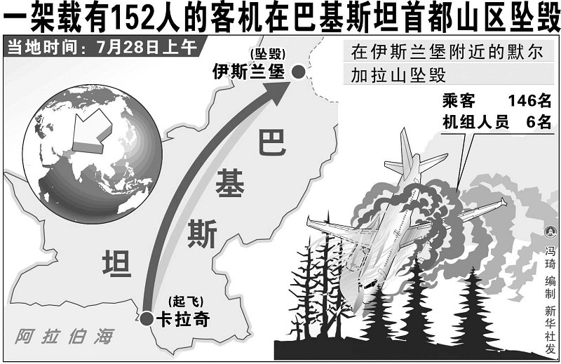 新华社7月28日电 一架载有152人的客机当地时间28日上午在巴基斯坦首都伊斯兰堡附近的默尔加拉山坠毁,机上152人全部遇难。官方公布的乘客名单中没有中国人。