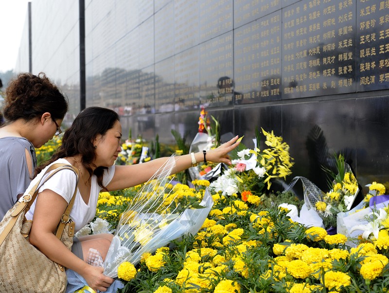 7月28日,市民在唐山地震纪念墙前向罹难亲人献花。当日,唐山各界干部群众在唐山地震遗址纪念公园集会,纪念唐山抗震34周年。 (新华社发)