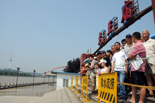 7月29日,武汉市民在龙王庙观江平台警戒线外观看洪水。当日,武汉龙王庙观江平台拉起警戒线,禁止市民入内游玩。目前,武汉市遭遇历史上罕见的长江、汉江洪峰夹击,给防汛带来巨大压力。 (新华社发)