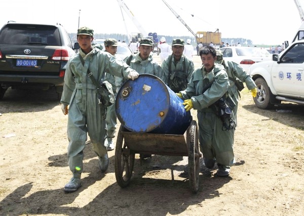图为:29日,救援人员在吉林省榆树市五棵树镇码头将打捞起的化工物料桶运往储存处。 (新华社发)