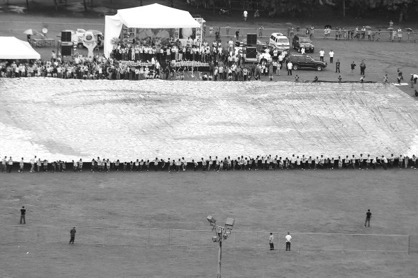 7月31日,在菲律宾首都马尼拉,人们用3200余张已故前总统科拉松·阿基诺(阿基诺夫人)的照片拼出一幅76米×70米的巨幅画像,纪念她去世一周年。阿基诺夫人是现任菲律宾总统贝尼尼奥·阿基诺的母亲。 (新华社发)