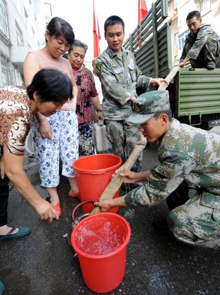 8月2日,通化市驻军某部送水车为通化东昌区居民送水。当日,吉林省通化市设立22个供水点,出动消防车辆180台次,送水1700多吨,缓解30万城市居民生活用水困难。 (新华社发)
