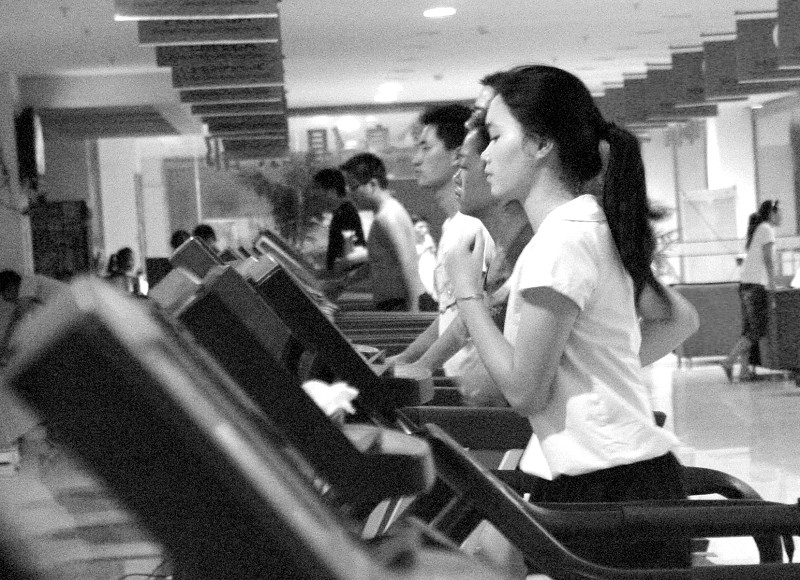 连日气温节节攀升,随州城各健身场所参与健身锻炼的青少年却热情不减。图为一些青少年正在帕菲克健身会所利用健身器械锻炼身体。(本报记者 张顺 摄)