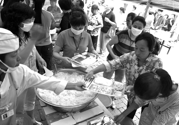 8月4日午饭时间,永吉县第三十五中学安置点的群众在排队打饭。 (新华社发)