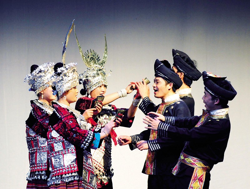 8月6日,在英国苏格兰首府爱丁堡,来自中国贵州民族歌舞团的演员在边缘艺术节上表演中国西南地区苗族和侗族特色的《鼓韵:蝉歌》。爱丁堡八月艺术季中规模最大的边缘艺术节于当天开幕。来自世界各地的艺术家将在爱丁堡的各处剧场和街头举行2453种、超过4万场次演出。 (新华社发)