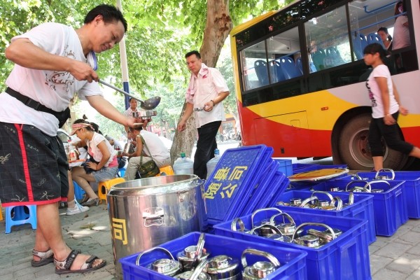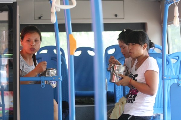 8月9日中午11点半,记者在随州城区烈山大道一公交车停靠点看到,随城主要公交线路近300名公交司机、售票员正吃着由随州市公交公司提供的免费午餐 (上图)。据公交公司的相关负责人介绍,酷暑天气,一切为了市民乘车方便,让人休车不休,确保公交车按时按点正常运行。左图:被高温“烤”验的售票员,为了公交事业,每天工作在车上,吃在车上。