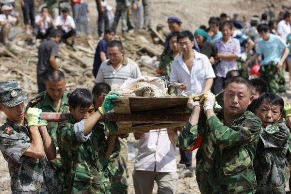 8月9日,救援人员抬出一名遇难者遗体。当日,在甘肃省甘南藏族自治州舟曲县泥石流灾害现场,解放军、武警、消防官兵和民兵全力进行生命大救援,搜救群众。