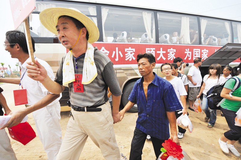 随县民政局工作人员拉着移民杨泽民的手,将他全家带往新家。(本报记者 李文军 摄)