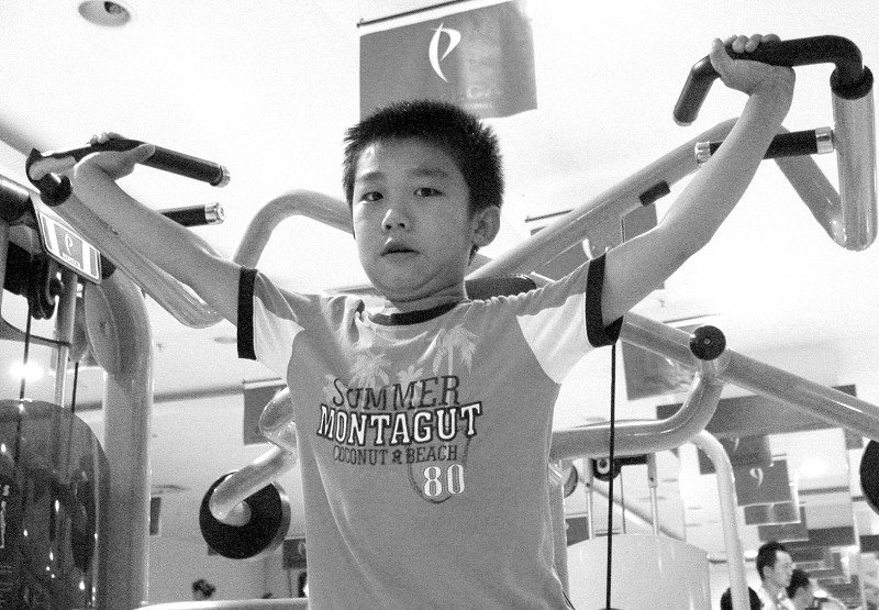 随着健身场所和器械的增多,给青少年锻炼身体增强体质,提供了更好的条件。图为一小学生利用健身器械锻炼臂力。(本报记者 张顺 摄)