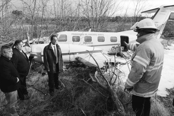 8月13日,一架小型飞机在布宜诺斯艾利斯省的梅塞德斯市坠毁。由于飞机没有爆炸,因此搭乘飞机的布宜诺斯艾利斯省司法和安全局局长卡萨尔和最高法院检察官法尔布幸免于难。图为布宜诺斯艾利斯省省长丹尼尔·肖利(左三)在查看事故现场。 (新华社发)