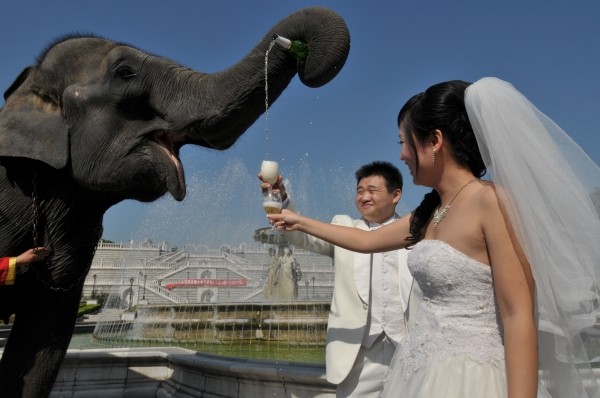 8月16日传统七夕节到来之际,北京世界公园的一头非洲大象为一对新人斟酒助兴,庆祝节日。中国民间文艺家协会主席冯骥才说,“七夕节”是一个以牛郎织女的民间传说为载体,以爱情为主题,以女人为主角的节日。据介绍,源于牛郎织女爱情故事的七夕节在我国已有2000多年历史,比西方国家每年2月14日过的情人节早得多。春节、元宵节、端午节、七夕节、中秋节等传统节日,都是“活着的文化”,它们集中体现着古老东方文化的独特、优美。 (新华社发)