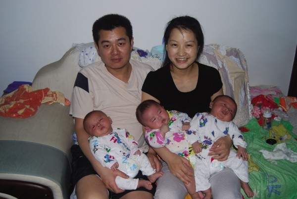 浙江贝因美科工贸公司武汉分公司随州经销处,为随县万和镇万和街道中心棉花采购站三胞胎宝宝免费提供一年的奶粉、米粉等各类贝因美幼儿专业食品。图为近日程剑义、王兰兰夫妇和他们壮实的三胞胎宝宝合影照。 (洪鹏 摄)