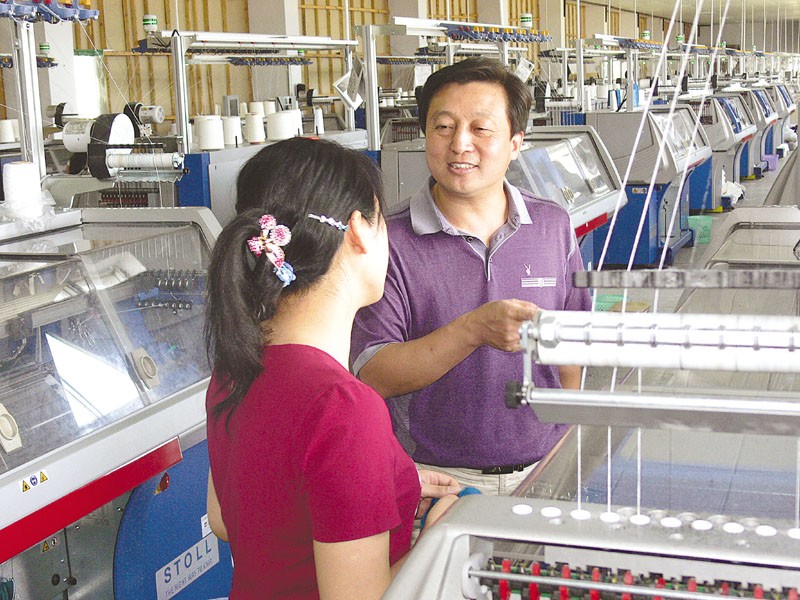 随州经济开发区农村工作局局长李清国在联力针织了解企业生产情况。