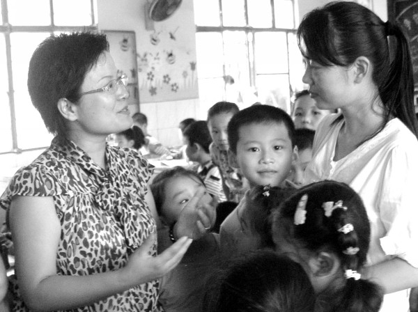 特级教师黎晓云(左)正同青年老师探讨课堂教学