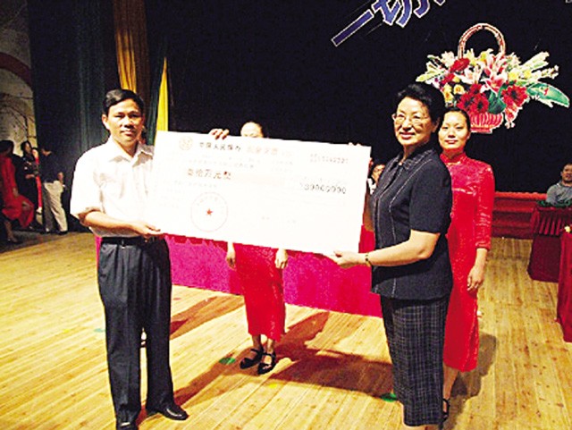 广水市教育局长明社民在第一次“圆梦”行动上接受广水籍在外爱心人士捐款