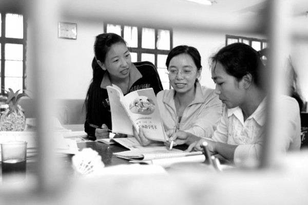 图⑤:课余,三姐妹在办公室里探讨教学教改经验。