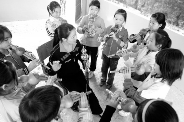 图②:课余时间,汪露指导葫芦丝兴趣小组的学生演奏。