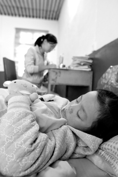 图④:深夜,黄霜伴着沉睡的女儿,为学生批改作业。