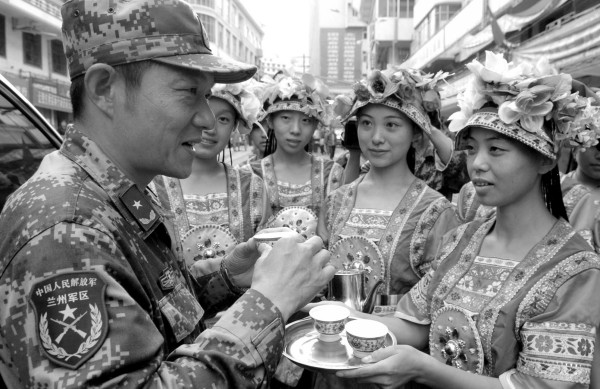 9月10日清晨,在舟曲县城南街,几名身着民族服装的姑娘端着米酒用传统方式送别子弟兵。当日,承担甘肃舟曲特大山洪泥石流灾害抢险救灾重任的解放军和武警官兵,在连续奋战了一个多月之后,开始陆续撤离舟曲。灾区群众依依不舍,沿路深情送别人民子弟兵。 (新华社发)