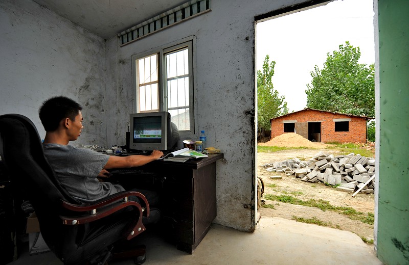 图1:二毛正在网上了解生猪销售价格走势。透过他卧室的门可以看到养猪场两排猪舍中的一排。