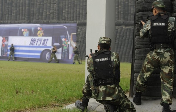 9月15日,在成都某训练基地,武警四川总队的反恐精英们在演练处置大巴车上武装劫持人质事件。