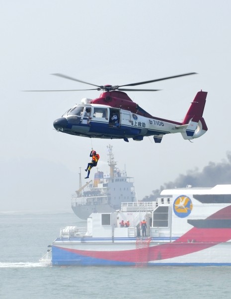 约30分钟的时间里,在面积约为6.2平方公里的演练水域内,来自大陆方面的9艘船艇和两架专业救助直升机,台湾方面的5艘船艇和1架直升机有条不紊地进行着共8个科目的海上搜寻、消防、人员救助、善后恢复等各项作业。