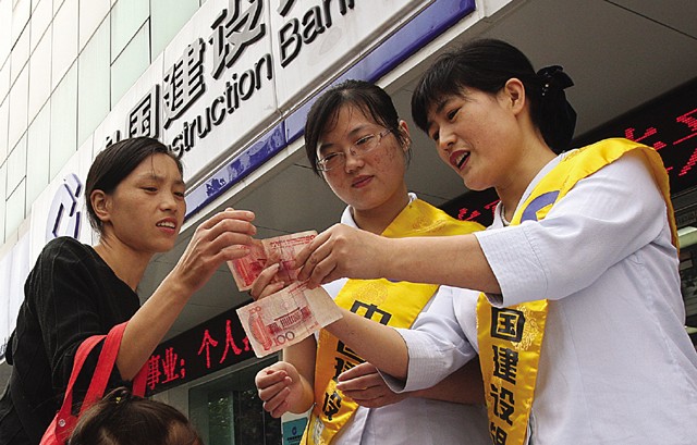 9月中旬,建行员工在随州城区教市民识假币。当日,我市金融系统启动假币宣传月活动,金融机构228个网点向社会各界宣传反假币知识。据了解,今年1至6月底,随州金融机构共收缴假币15万多元。