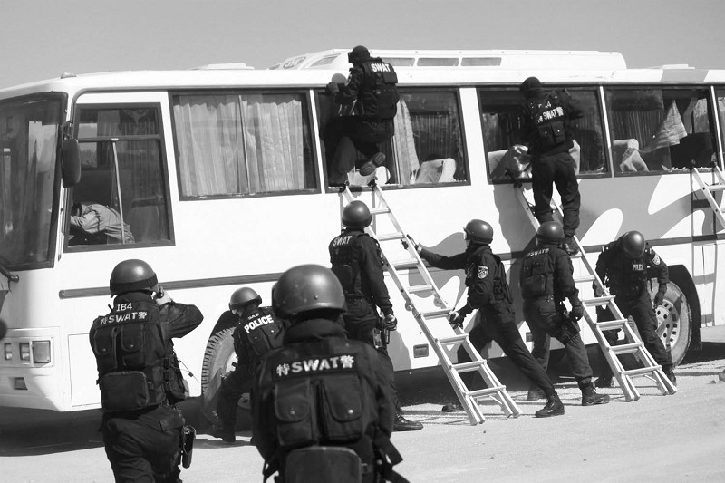 9月23日,特警队员演练处置“恐怖分子劫持大巴”事件。当日,北京市公安局举行首都公安特警和武警特战反恐处突联合实战演练。 (新华社发)