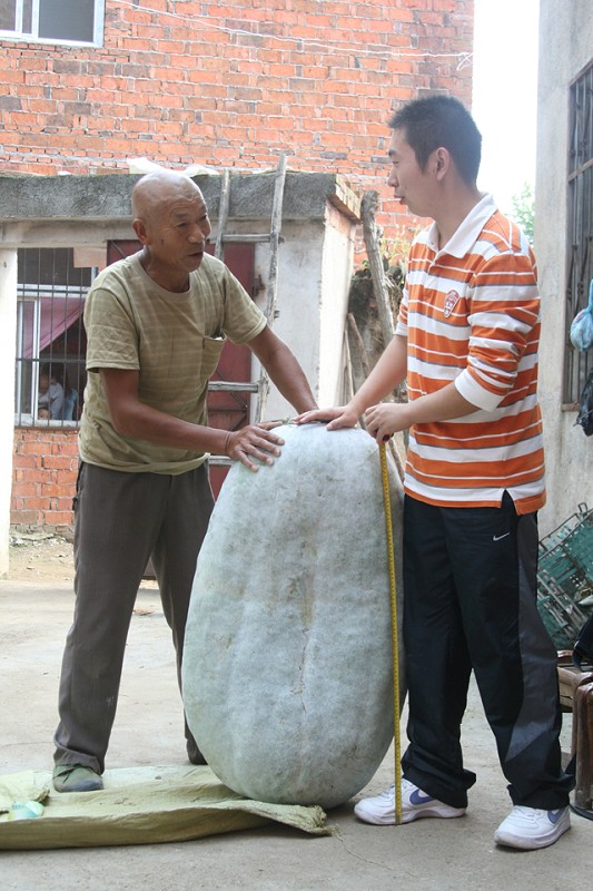 近日,随县厉山镇星旗村二组农民魏继明的地里产出一个大冬瓜,该冬瓜长91厘米,重114斤,堪称“冬瓜之王”。(徐军国摄)