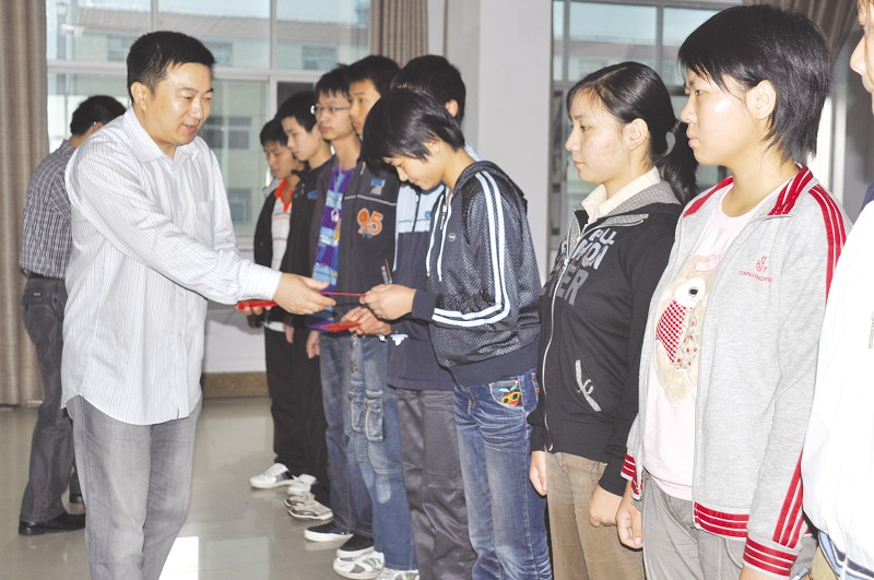 9月27日,周晓波励志基金发放仪式在随州二中举行。周晓波是我市钱庄投资担保公司董事长,他事业有成,但不忘扶贫济困。周晓波计划从2010年起,每年帮扶10名贫困学生完成高中到大学学业,让他们早日成材。图为周晓波在向贫困生发放助学金。 (本报记者 陈德友摄)