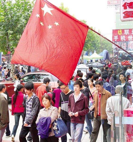 节日街头,商家门店悬挂的五星红旗迎风招展,随城处处洋溢着浓浓的喜庆气氛。(本报记者 杨闻名摄)