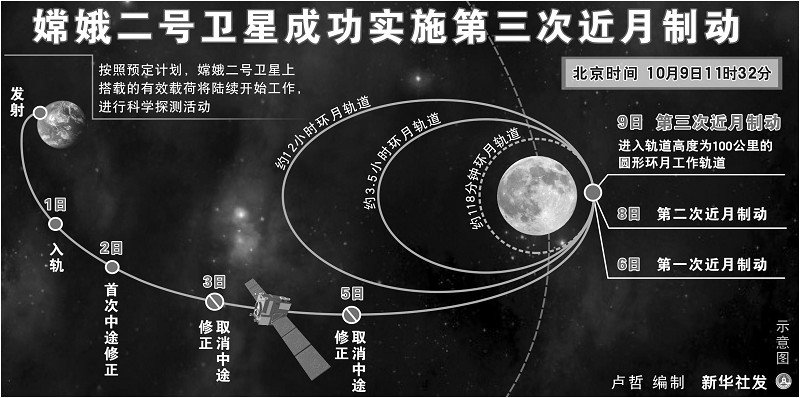 新华社10月9日电 9日11时32分,在北京航天飞行控制中心的精确控制下,嫦娥二号卫星成功实施第三次近月制动,顺利进入轨道高度为100公里的圆形环月工作轨道。