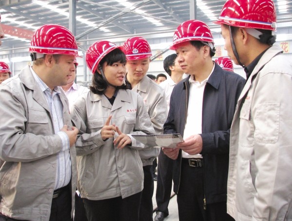 在曾都经济开发区奥马专汽公司观摩时,市委书记王祥喜(右二)向公司股东、加拿大客商韦伯(左一)了解企业新产品开发情况。 (本报记者 陈晓林摄)