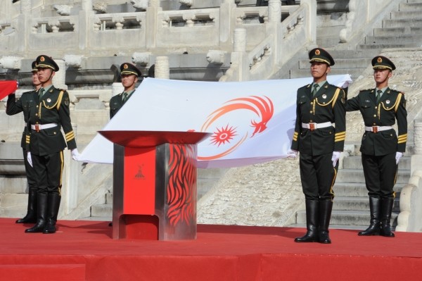 胡锦涛举起主火炬,向现场的中外来宾和各界群众致意。