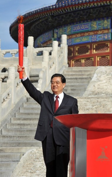 ·胡锦涛举起主火炬,向现场的中外来宾和各界群众致意。