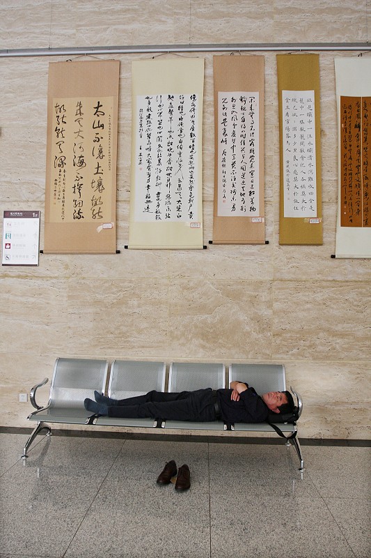 图2:10月7日,随州博物馆大厅内,一男士旁若无人的把鞋脱掉躺在长椅上酣睡,与其身后横挂的高雅书法形成反差,实在影响公共环境及文明形象。