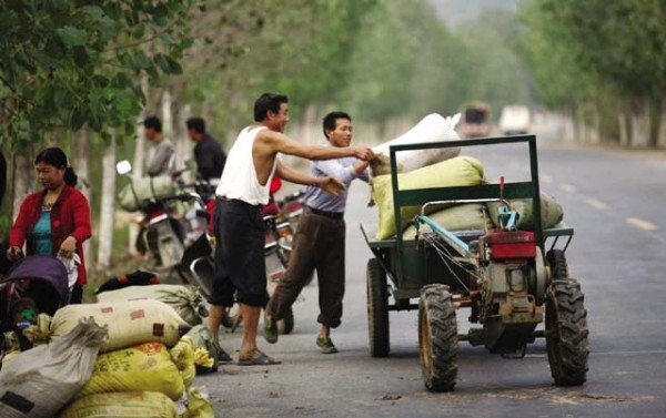 随县高城镇农民日前正将收割好的稻谷装车,准备卖到收购粮站。 (本报记者 孙洪涛摄)
