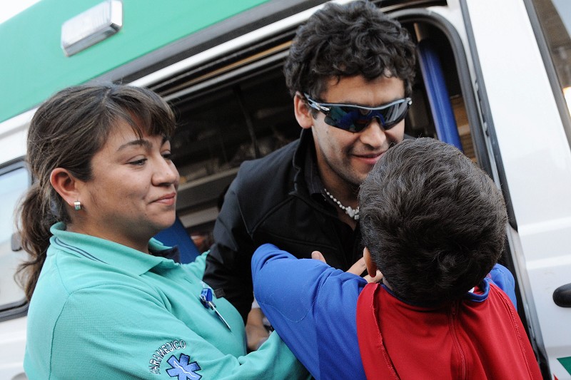 10月15日,在智利科皮亚波,获救矿工弗洛伦西奥·阿瓦洛斯·席尔瓦离开医院后与亲人团聚。当日,智利圣何塞铜矿获救矿工陆续回到家中。 (新华社发)