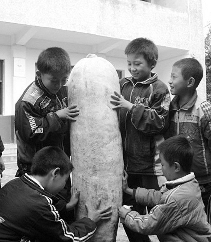 10月11日,曾都区洛阳镇建国中心小学六年级种植兴趣小组的同学们如获珍宝似的从学校菜园里扛回了一个“冬瓜王”。经测量过秤,冬瓜长近140厘米,重150余斤。(本报记者 杨闻名 通讯员 江兴伍 摄)