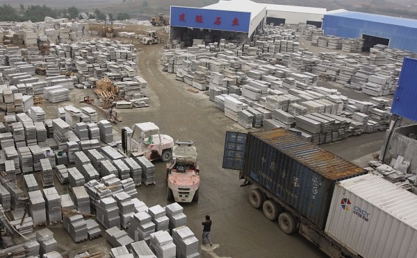 图③:在石材工业园区,每天有近百辆汽车来回拉运石材产品外销。