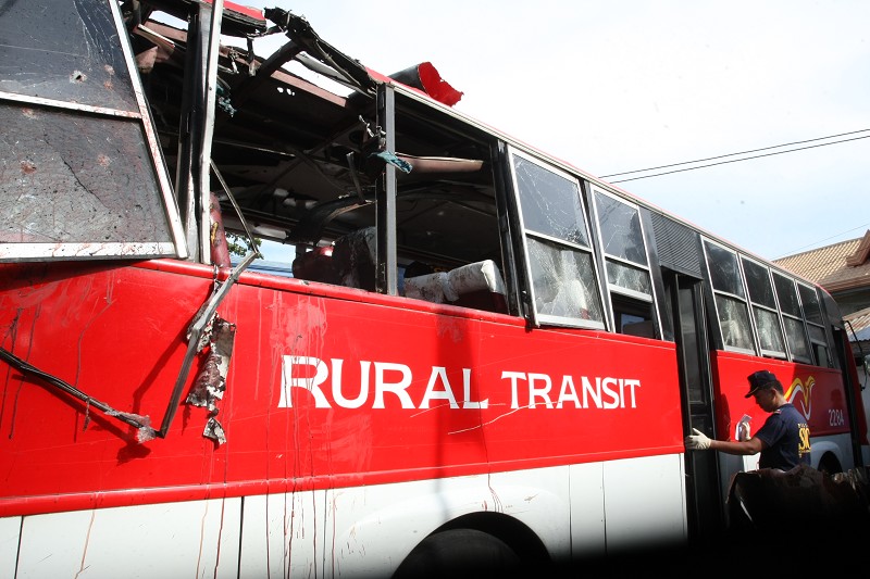 10月21日,在菲律宾北哥打巴托省马塔兰,警察在爆炸现场勘察。菲律宾军方官员说,一枚自制炸弹21日上午在菲南部一辆客车内爆炸,导致至少9人死亡、7人受伤。 (新华社发)