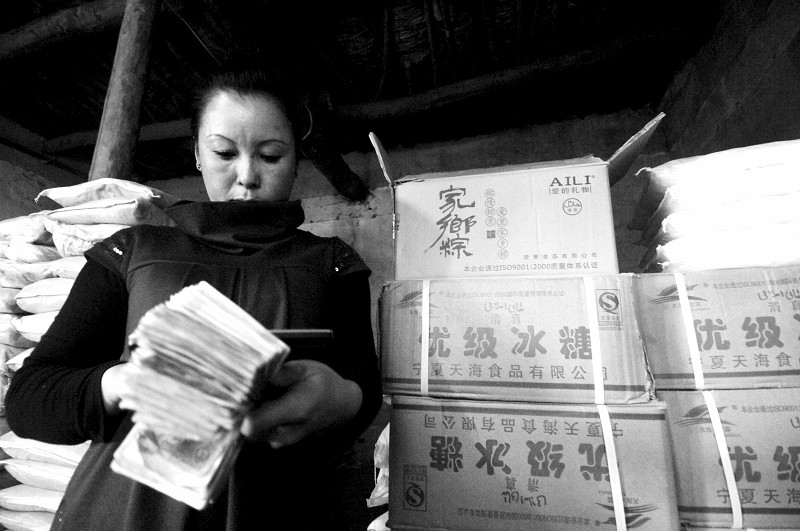 从今年4月份开始,银川的食用糖价格持续走高。目前,普通白糖的市场价由原来的2.7元/斤,上涨到3.5元/斤;红糖由原来的2.5元/斤,上涨到2.9元/斤。图为10月19日,在银川市东环批发市场内,一位批发食用糖的店主正在清点当日的账目。 (新华社发)